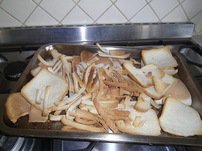 When I make Tupperware Jel Ring sandwiches or a Jel Ring Tuna Mornay Bake, I place the crusts into freezer bags. When, I have several bags stored in the freezer (and it is getting too cluttered), I pour them onto a baking tray; put them in a 200C oven and bake for about 10-15 minutes.