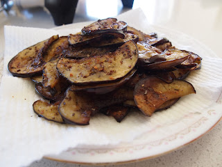 Thinly slice eggplant length ways and heat oil in a non-stick frying pan on high heat. Cook eggplant, in batches, for 2 to 3 minutes each side or until tender and golden.