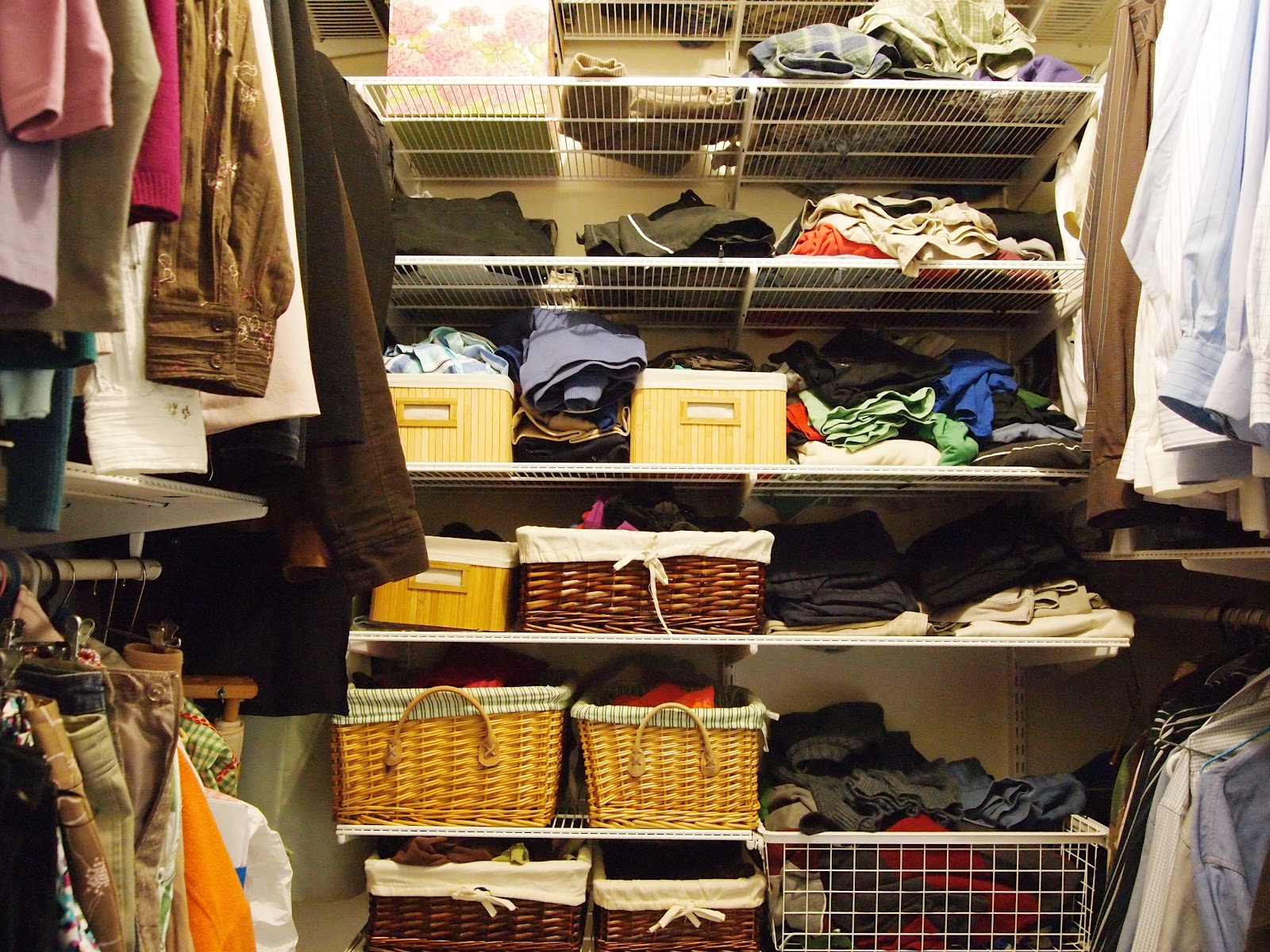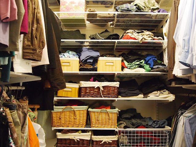 Today however, I want to share the before and after of my walk-in-robe. Hubby (who already has most of the storage areas), decided to take MORE of my section for his own. Hence, I was fed up and got in there and did a major sort and fold.