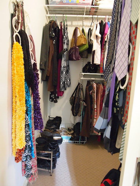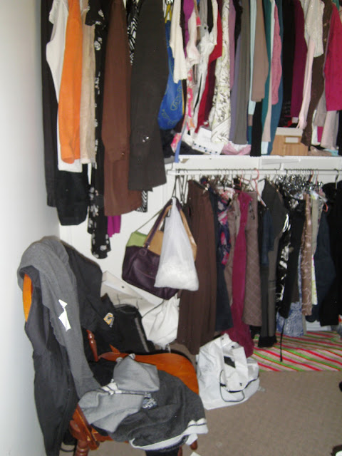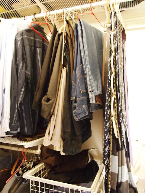 BEFORE: Upon entry to my robe you see MY side; although hubby has put some of his trousers to the left of my dresses and coats.