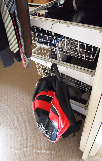 Next to the right, hubby has two rows of hanging space and another 3 extra sliding wire drawers. You can just see an empty pants hanger to the right up near a woollen vest he is not using *sigh*.