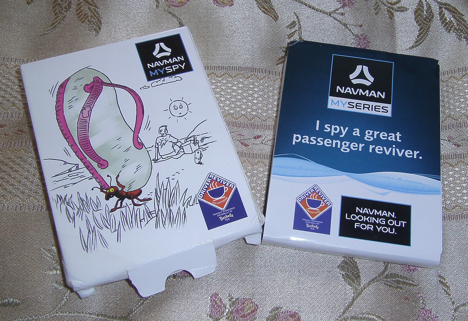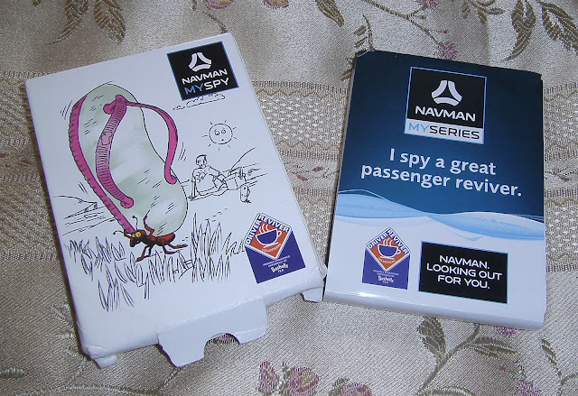 Free coffee/tea/hot chocolates are given along with biscuits and small gifts for the kids. They each got a pack of NAVMAN MYSPY cards .