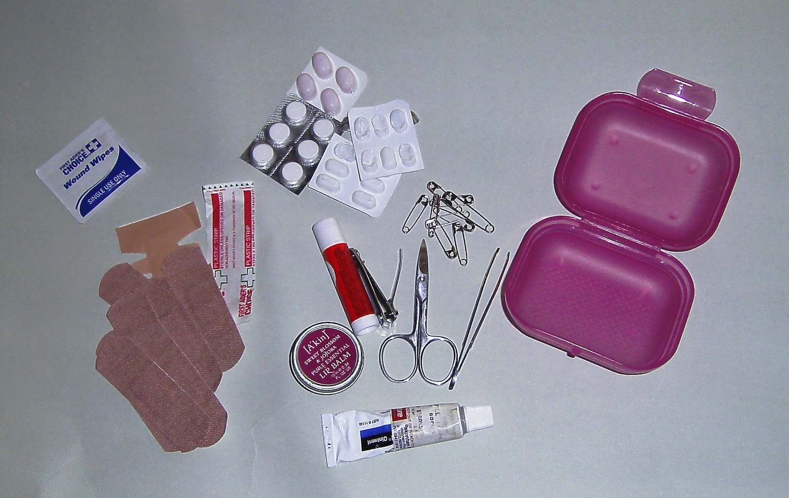Wound Wipes, band-aids, pain killers, lip balms, safety pins, nail clippers, nail scissors, tweezers and skin/wound ointment.