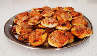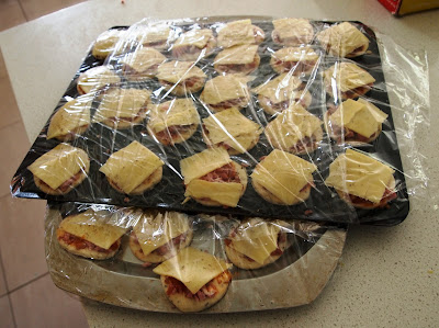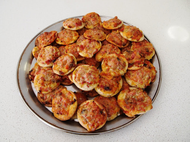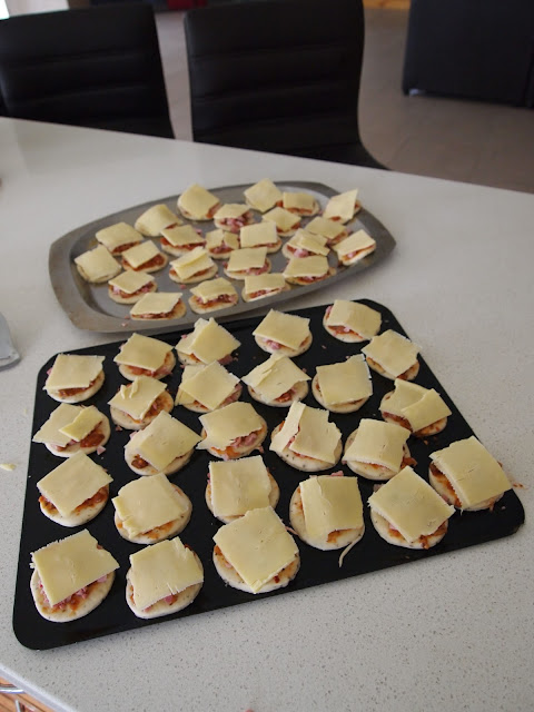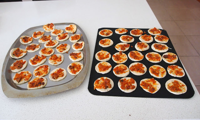 These are very simply made, due to the fact that a Grade 1 class will be eating them for their end of year school party tomorrow. Normally I would put gourmet ingredients on top eg. sundried-tomatoes, pesto sauce, olives, chives etc.