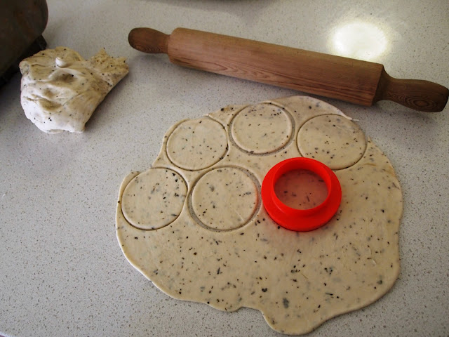 Roll out the dough to the thickness of about 2 – 4cm. Using a cookie cutter (mine is a Tupperware one), cut out as many circles as you can fit onto each rolled out sheet of dough. Gather the off cuts, roll out again and continue using all the dough. If you have a little dob left over, roll a ball in your hand and flatten into a pizza shape too.