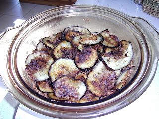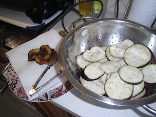 1. Slice Egg Plants, pack into colander, sprinkle with salt, place plate with heavy weight on top for ½ hour.